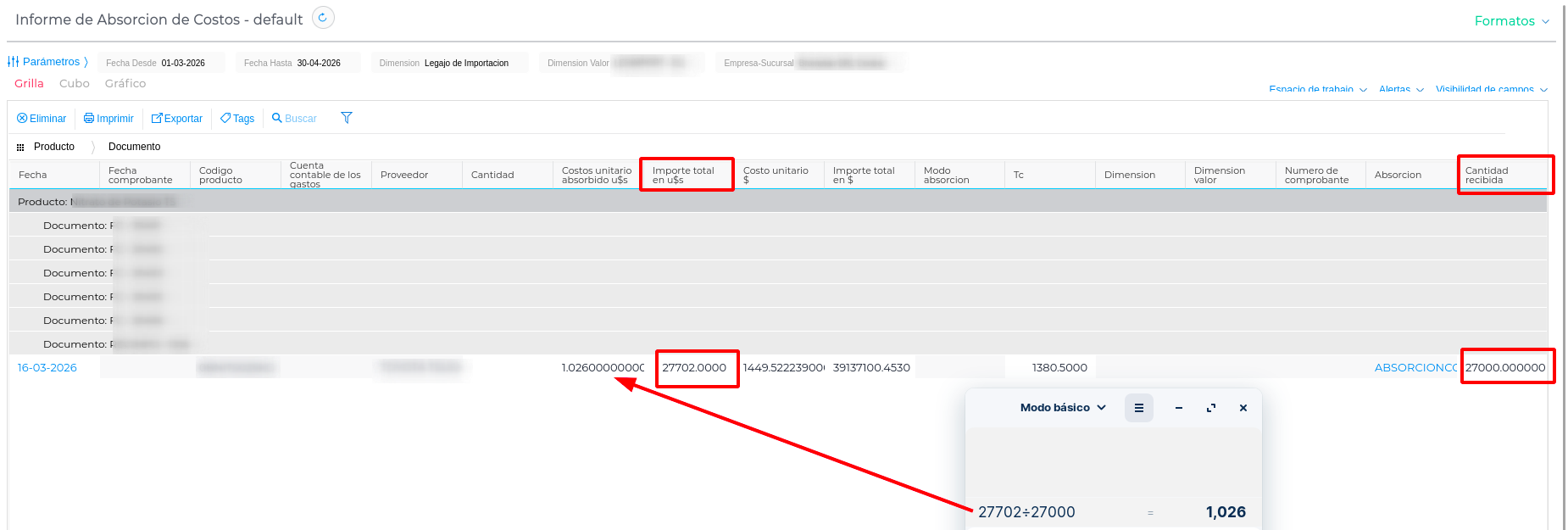 Durante el proceso de absorción, el sistema toma el importe total resultante de todas las transacciones involucradas en el legajo (mercadería, gastos asociados, fletes, diferencias de cambio, entre otros) y lo distribuye sobre la cantidad recibida. Por este motivo, el costo unitario absorbido en U$S no surge de convertir el costo unitario en pesos mediante un tipo de cambio puntual, ni mantiene necesariamente el valor unitario original de la factura. En cambio, refleja el costo final del producto luego de aplicar todo el proceso de absorción.