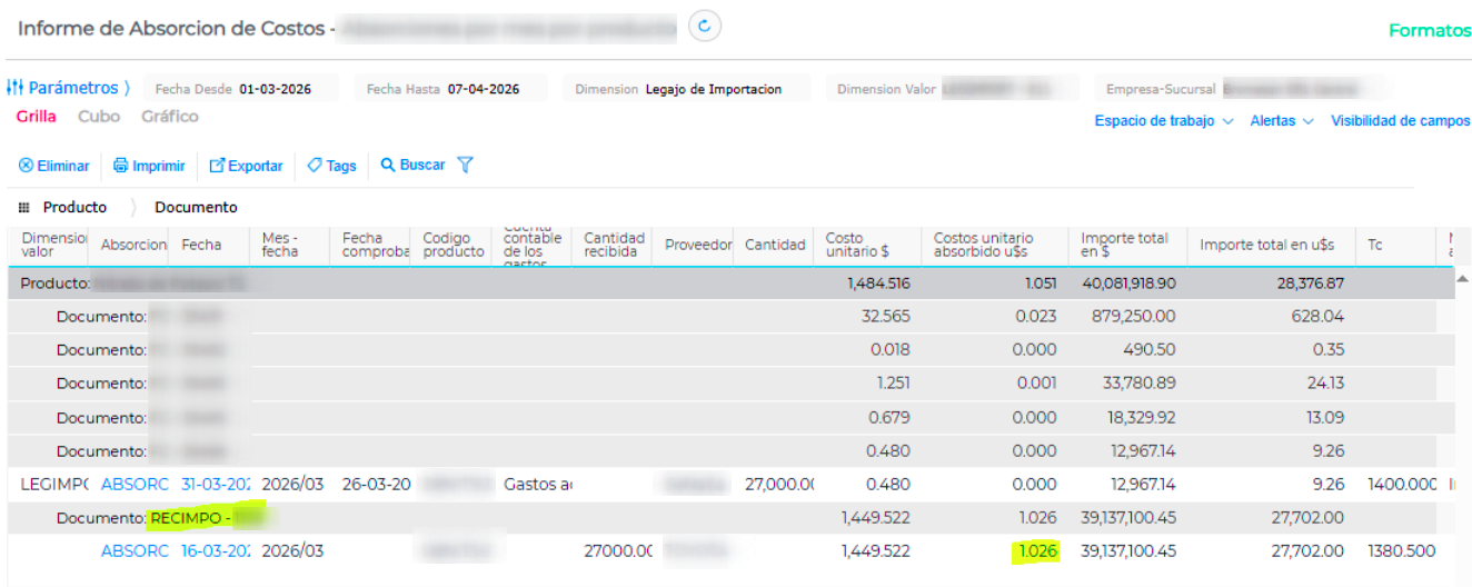 En caso de necesitar visualizar el precio unitario de la factura de importación, ese valor puede consultarse directamente desde el comprobante de compra o a través de los reportes de compras, ya que el informe de Absorción de Costos muestra el costo final resultante del proceso.