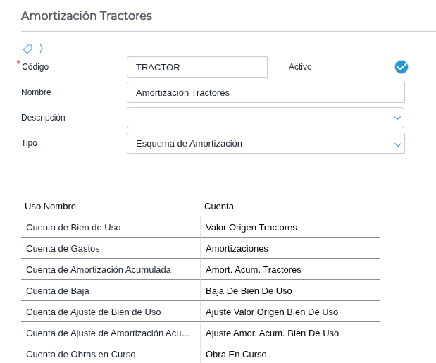 En el esquema contable se asignan todas las cuentas que corresponden usar cada vez que se amortice un determinado bien: cuál es la cuenta de obra en curso, la de valor de origen, la de amortización, de amortización acumulada, la de ajuste, entre otras.