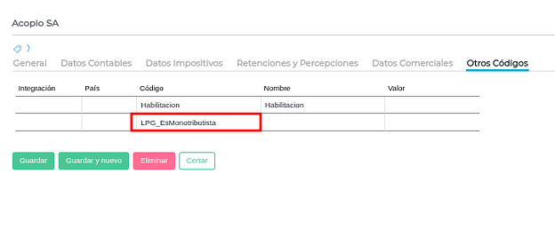 Al ingresar a la solapa “Otros Códigos”. podemos visualizar el código adicional LPG_EsMonotributista previamente configurado desde el maestro de Datos, el mismo se usa para obtener COE en las Liquidaciones de compra de granos a monotributistas. Hay varias funcionalidades del sistema que usan este tipo de códigos adicionales.