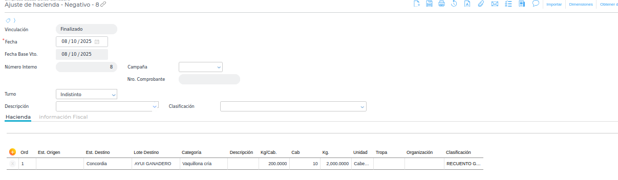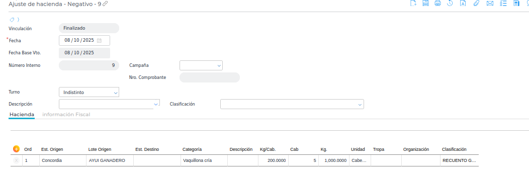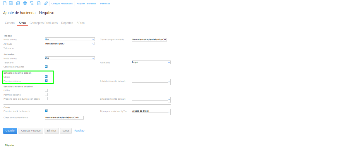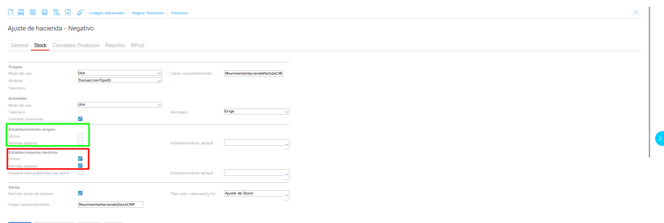 En la configuración del tipo de documento del “Ajuste de hacienda - Negativo”, si los checks “utiliza” y “permite editarlo” en la solapa Stock están activados para el establecimiento origen, al realizar un ajuste negativo se descontarán cabezas de ese establecimiento.
