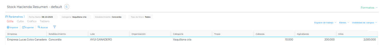 En la captura de pantalla anterior se puede ver el detalle, en el cual con el mismo tipo de documento se generó un ingreso de stock y luego, configurando el tipo de documento correctamente, redujo stock. Por ende, se deben activar los checks “Utiliza" y "permite editarlo” en el apartado del establecimiento origen para el tipo de documento mencionado, para así poder cargar la cantidad de cabezas en positivo y que el sistema interprete que esas cabezas egresan del stock.