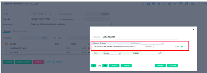 - Duplicar el asiento genérico existente y asignarle un código y nombre específicos que lo identifiquen con el ajuste por inflación.