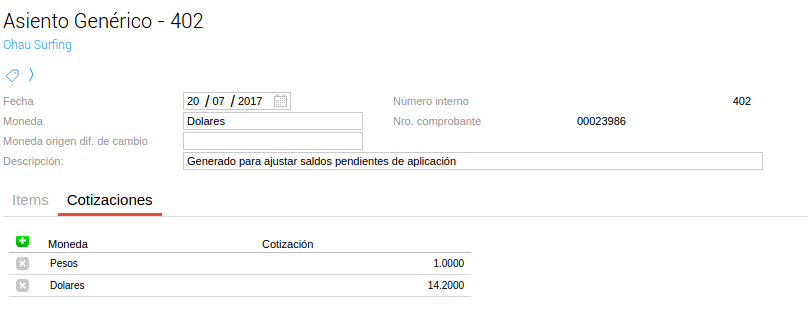 Si la moneda del comprobante es distinta de la principal, se generará un asiento por cada comprobante a ajustar.
