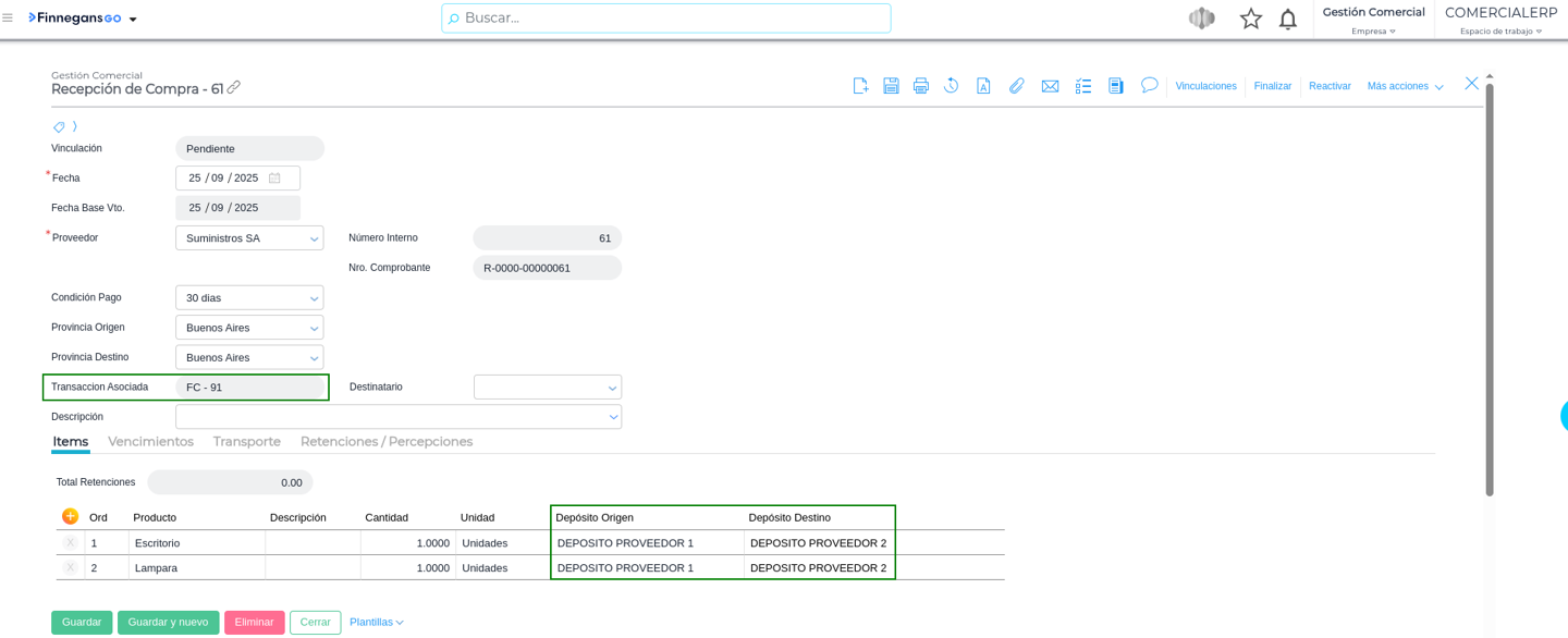 Al ingresar en la Recepción de Compra, en los datos de cabecera está asociado el número de Factura y en los ítems se visualizan los depósitos configurados en el tipo de documento: