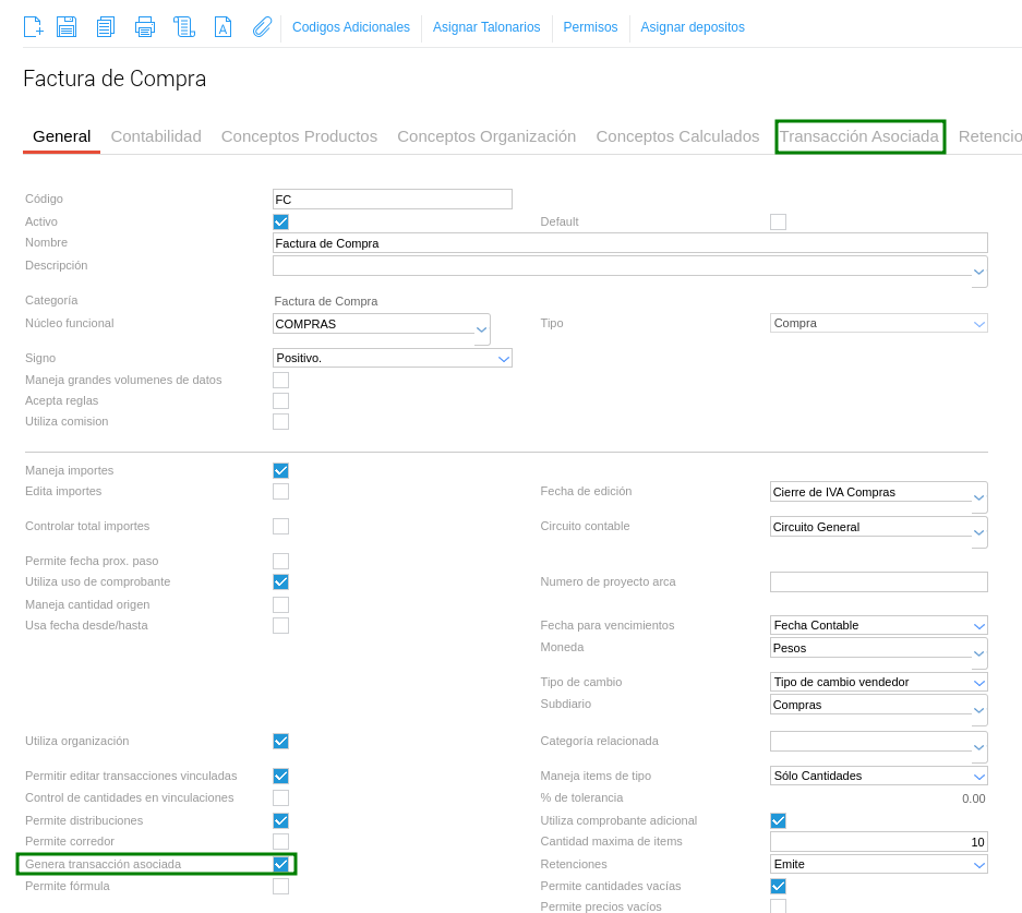 Por otro lado, tenemos las transacciones asociadas que son documentos generados automáticamente a partir de otro principal. Por ejemplo, generar automáticamente un Remito de Venta a partir de una Factura de Venta o una Recepción de Compra a partir de una Factura de Compra.