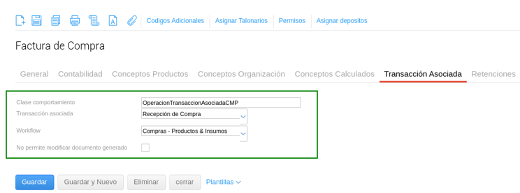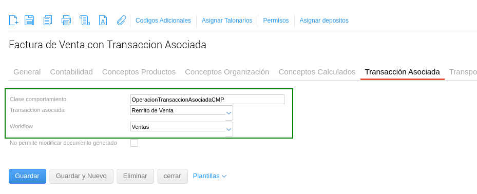 En la solapa “Transacción asociada” se define el documento a asociar automáticamente y el workflow.