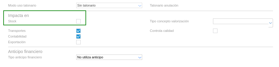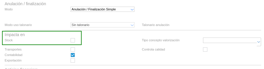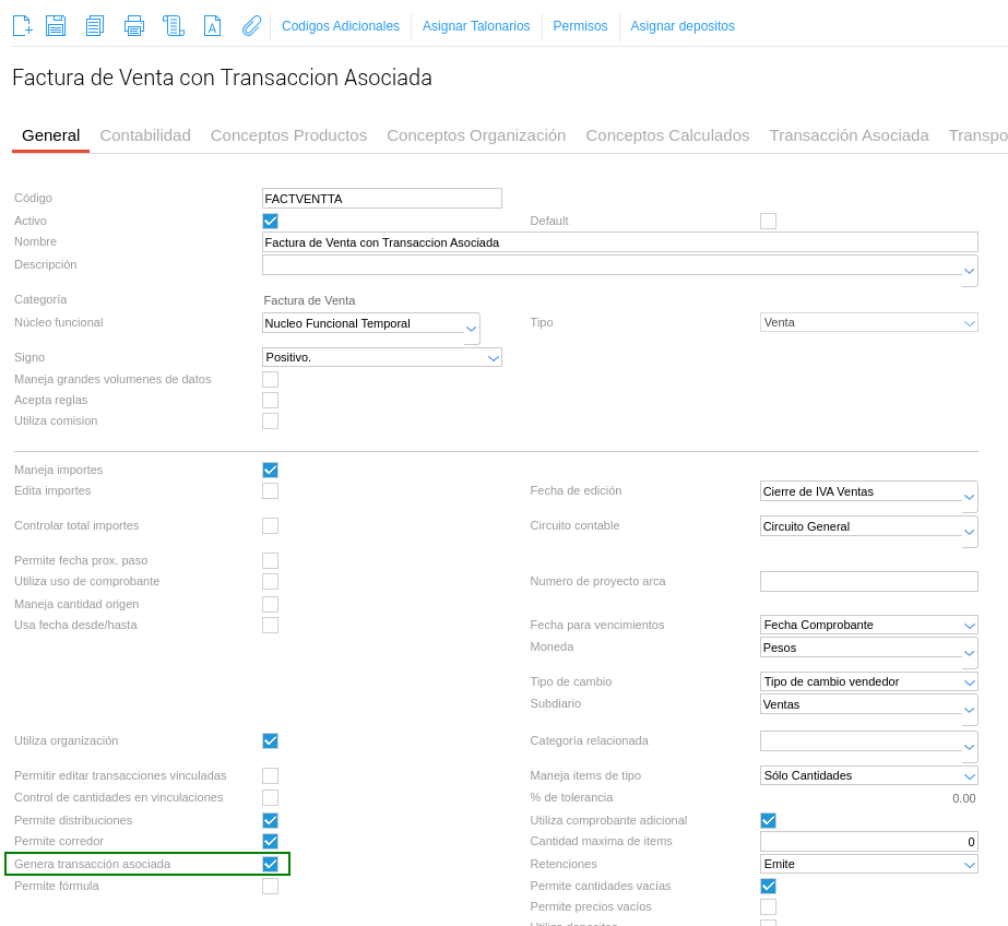 En la solapa “General”, activo el check de la casilla “Genera transacción asociada” y definido que no impacta en stock.