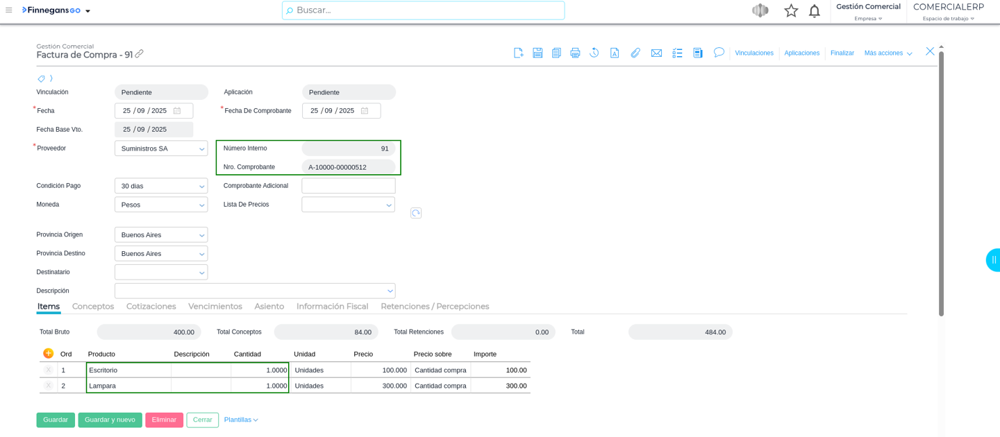 Al crear una Factura, esta genera automáticamente la Recepción: