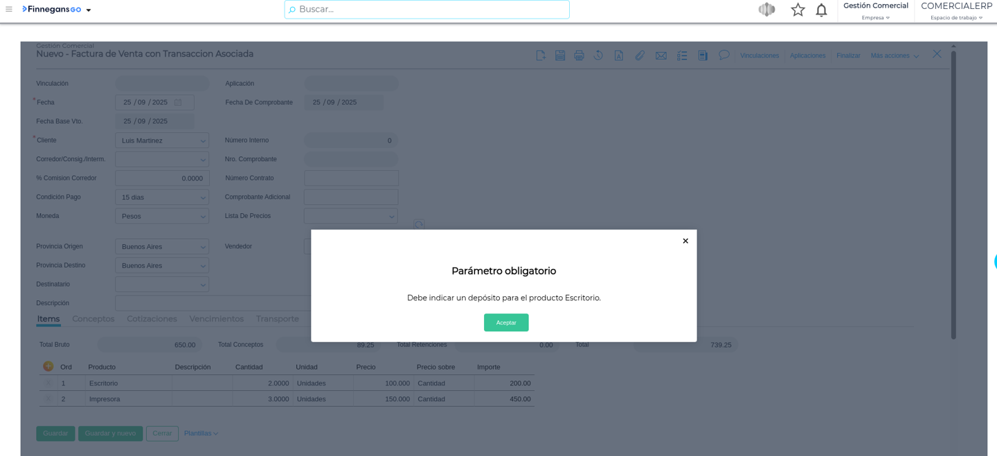 Caso de uso - Remito de Venta se genera como transacción asociada y usa depósitos por sucursal y no hay depósitos configurados en “Asignar depósitos”