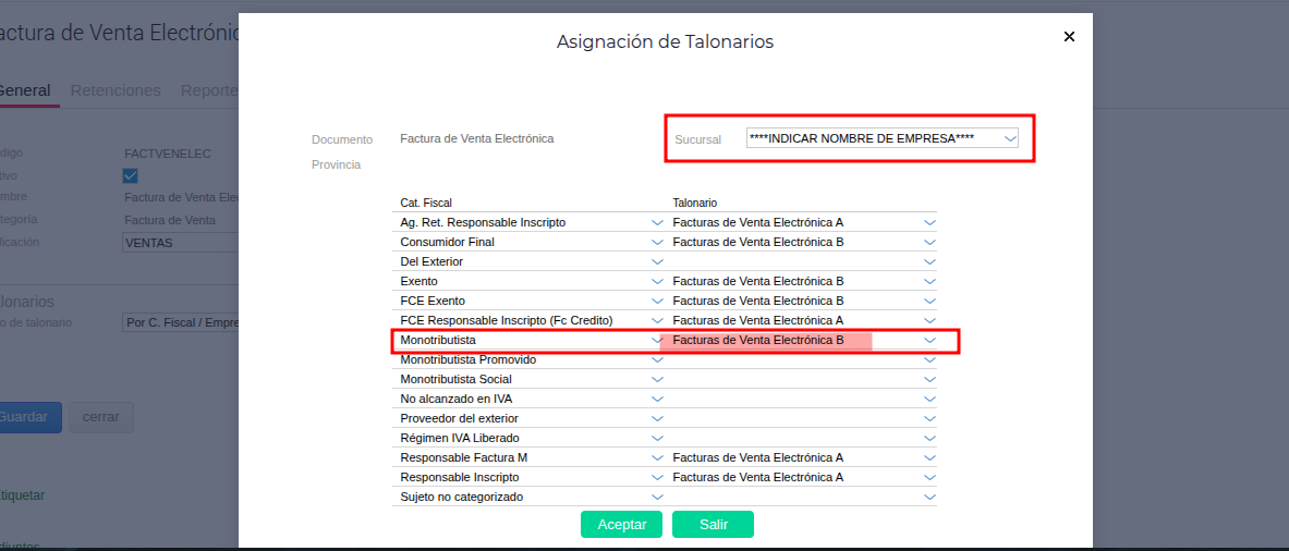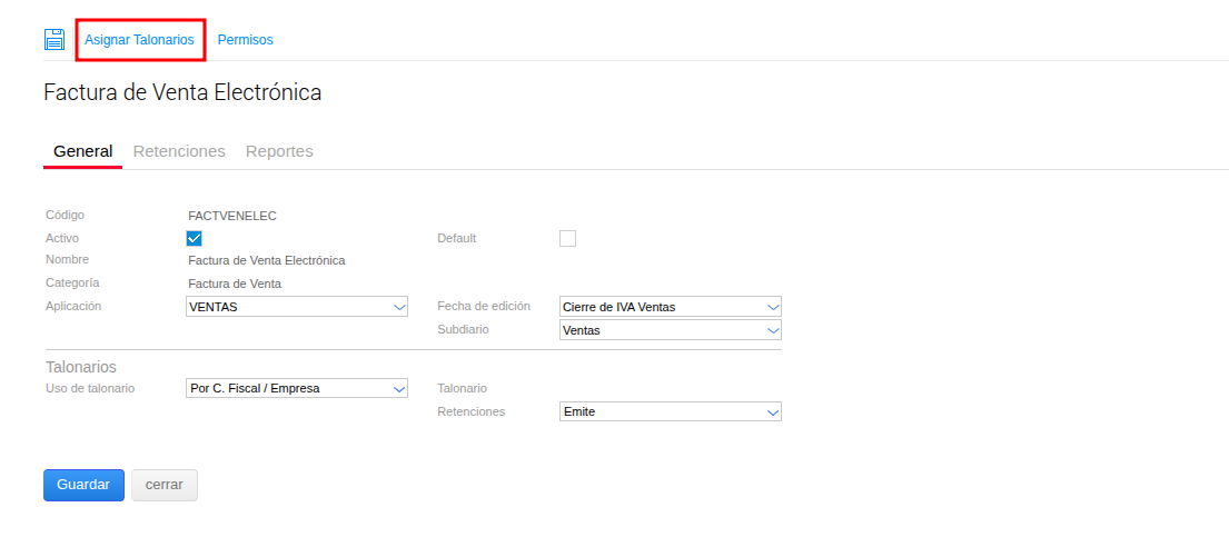 Y hacer click en la casilla contigua (resaltada con color rojo en el ejemplo) para seleccionar el Talonario.