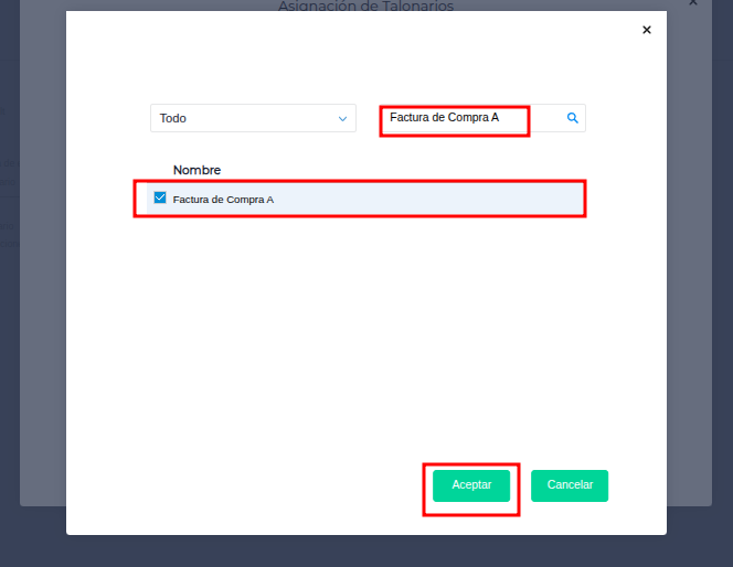 Buscar el Talonario, seleccionarlo y hacer click en ‘Aceptar’ para concretar la asignación.