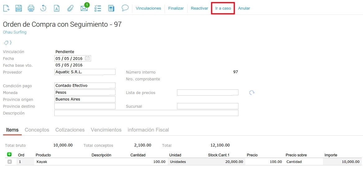 Se crea una Orden de Compra con Seguimiento por un total de $12.100,00 del producto Kayak para el proveedor Aquatic S.R.L.