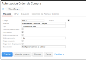 Se accede desde Menú→App Builder→ Diccionarios → Procesos, se selecciona “Autorización de Orden de Compra”.