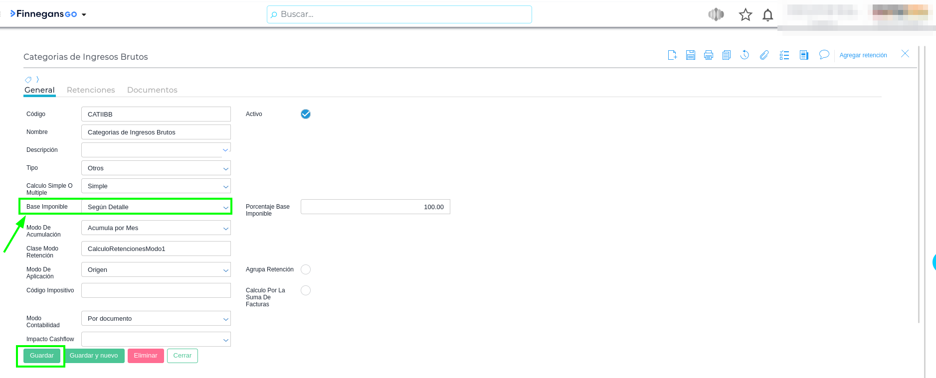 1 - Acceder a la configuración del tipo de retención Categorías de Ingresos Brutos y modificar el campo Base Imponible para que esté configurado como “Según Detalle”.