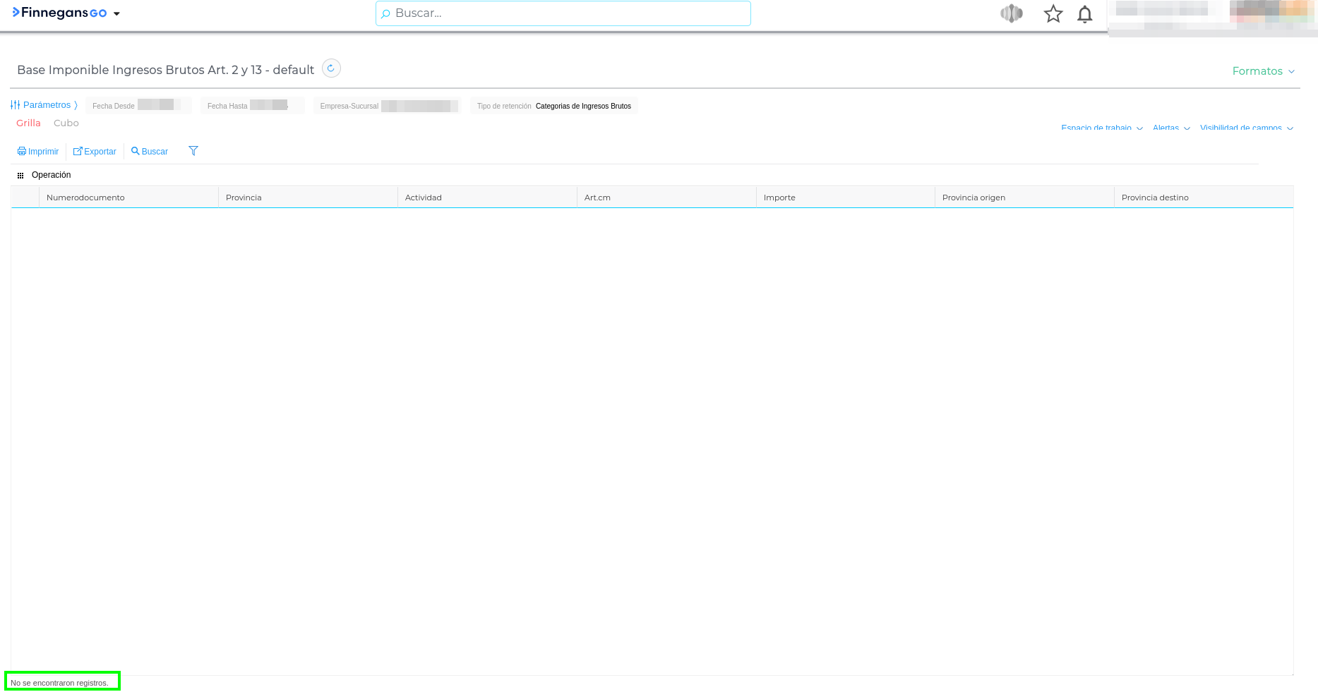 Consulta: Al intentar generar el informe Base Imponible Ingresos Brutos Art. 2 y 13, la grilla de resultados aparece vacía o sin ninguna información.