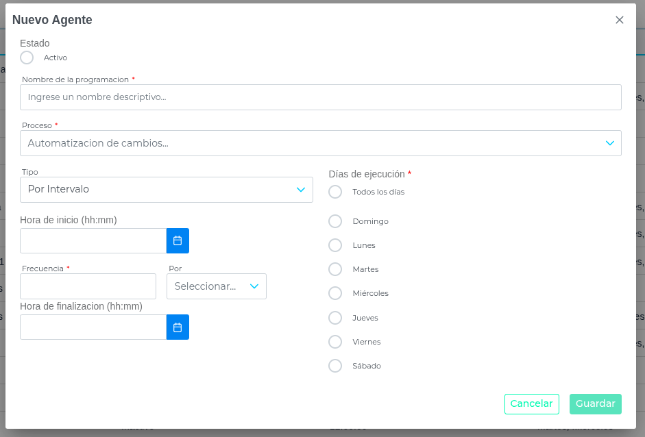 Días de ejecución: Qué días de la semana funcionará el agente.