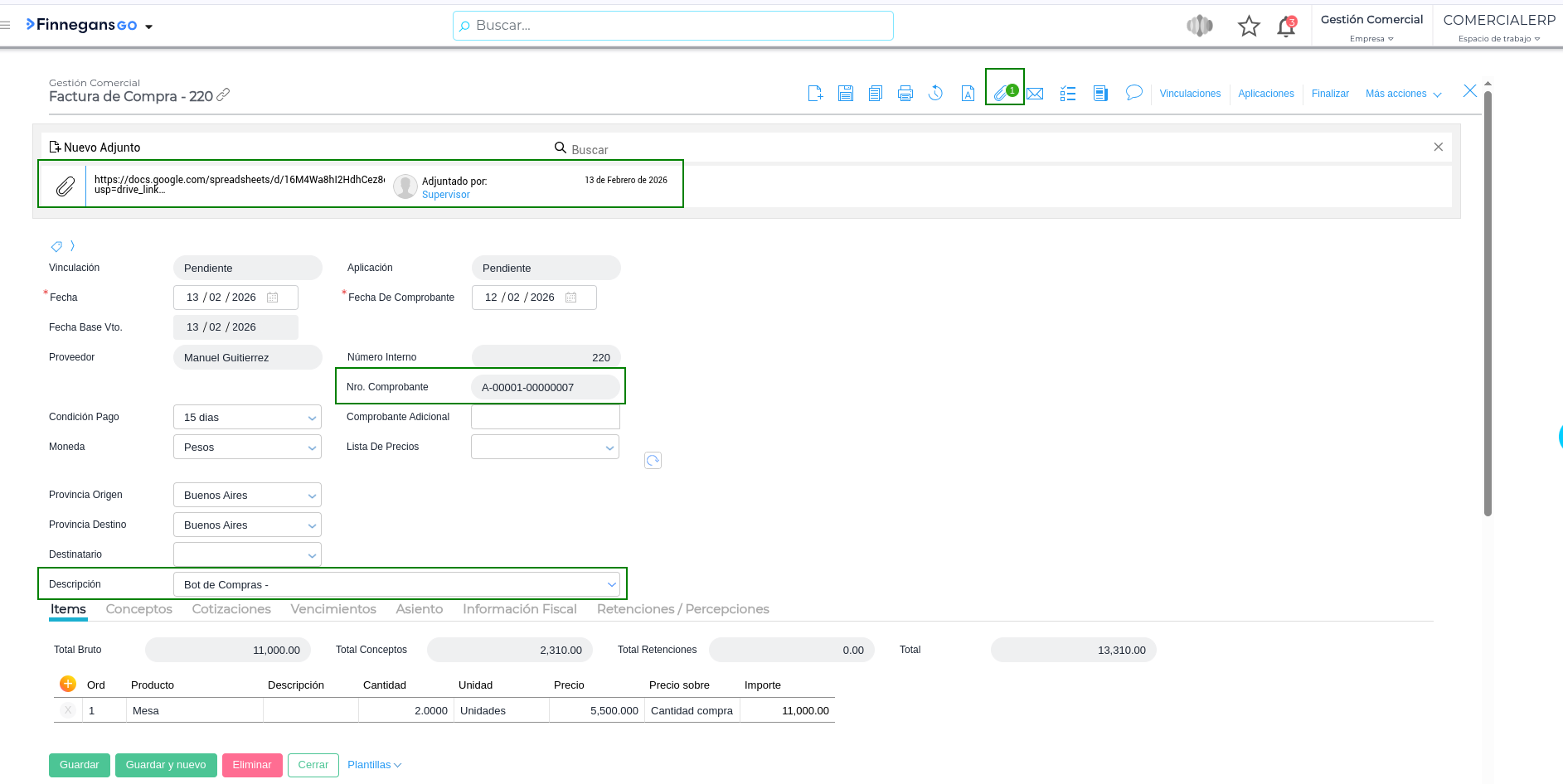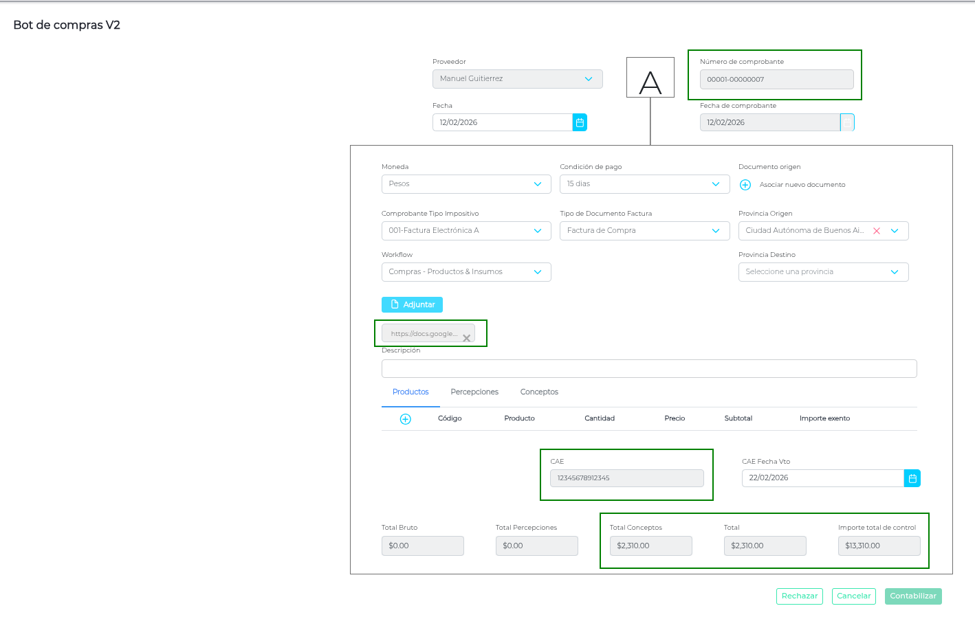 Permite crear una Factura de Compra directamente en el Bot de Compras con origen Deals. Además de los datos de la factura, el usuario puede enviar la URL para vincular un archivo adjunto, lo que posibilita que el Bot lo reciba, lo procese y lo deje correctamente asociado al documento que se genera en el ERP al momento de contabilizar la factura.