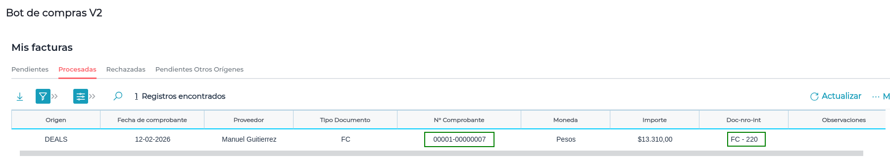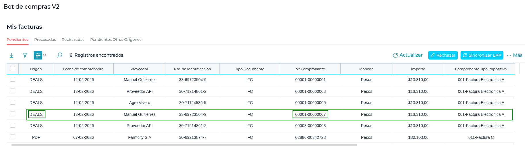 Ingresar al Bot de Compras para validar que la Factura se visualiza en la solapa de "Pendientes. Se visualiza como origen de la Factura Deals: