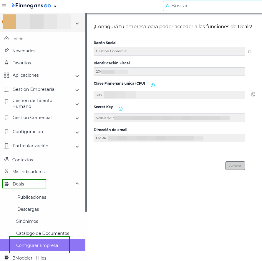 Se debe enviar el CFU (Clave Finnegans Única) y la Secret Key configurados en Deals para la Empresa, para esto ir a Menu > Deals > Configurar Empresa: