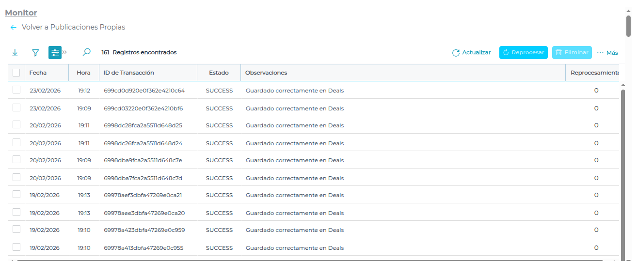 - Se debe esperar unos minutos (aunque el proceso puede también demorar unas horas). Luego se puede verificar si las liquidaciones aparecen en el monitor de Integración Directa de Deals: