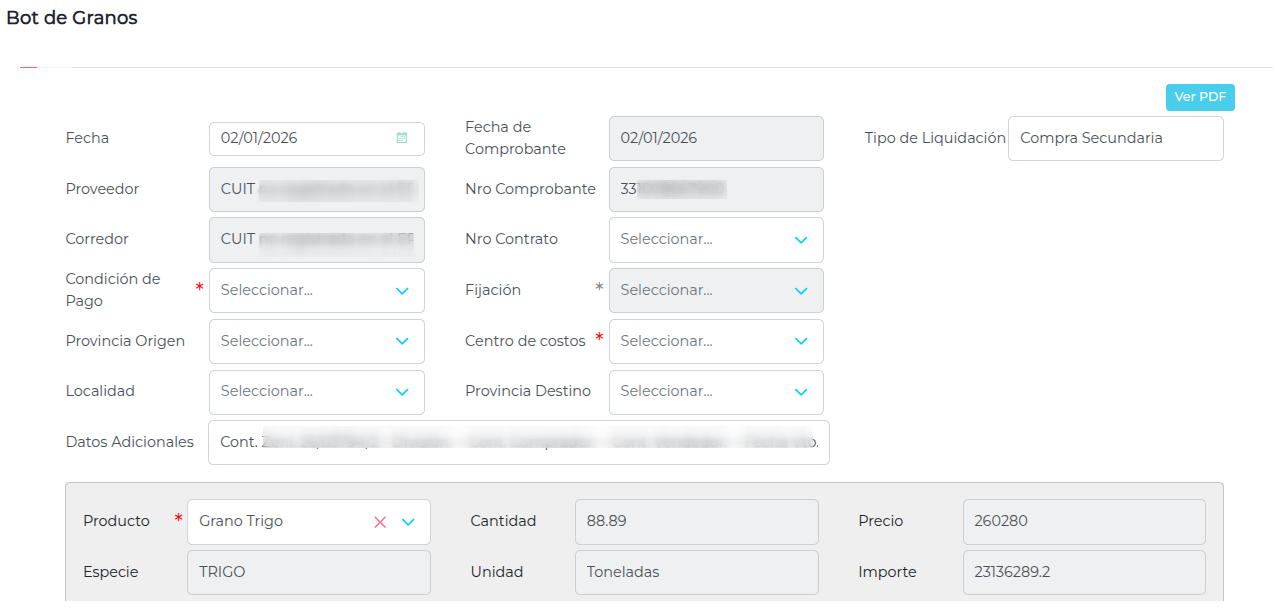 c. Para enviar liquidaciones del Bot de Granos al ERP el usuario tiene que ingresar una a una para completar los datos que hacen falta y que son solicitados por el ERP. Se hace click sobre cada uno de los ítems: