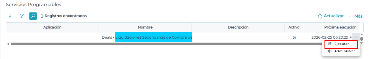 - Buscar el servicio “Deals - Liquidaciones Secundarias de Compra desde ARCA - NOMBREDELAEMPRESA”, presionar sobre los 3 puntitos de la derecha y presionar en Ejecutar.