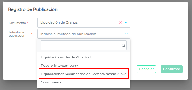 c. Definir el documento “Liquidación de Granos”, método de publicación “Liquidaciones Secundarias de Compra desde ARCA” y presionar en el botón “Confirmar”