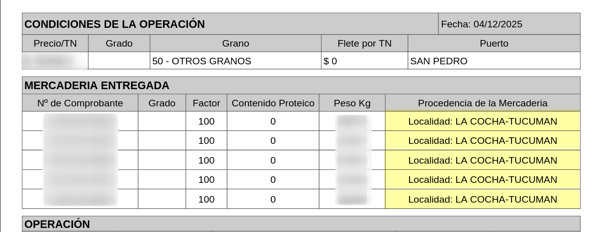 Si la misma no está certificada al llegar la liquidación, no tenemos el n° de comprobante, su origen ni su peso. Solo trae una línea con su factor y el contenido.