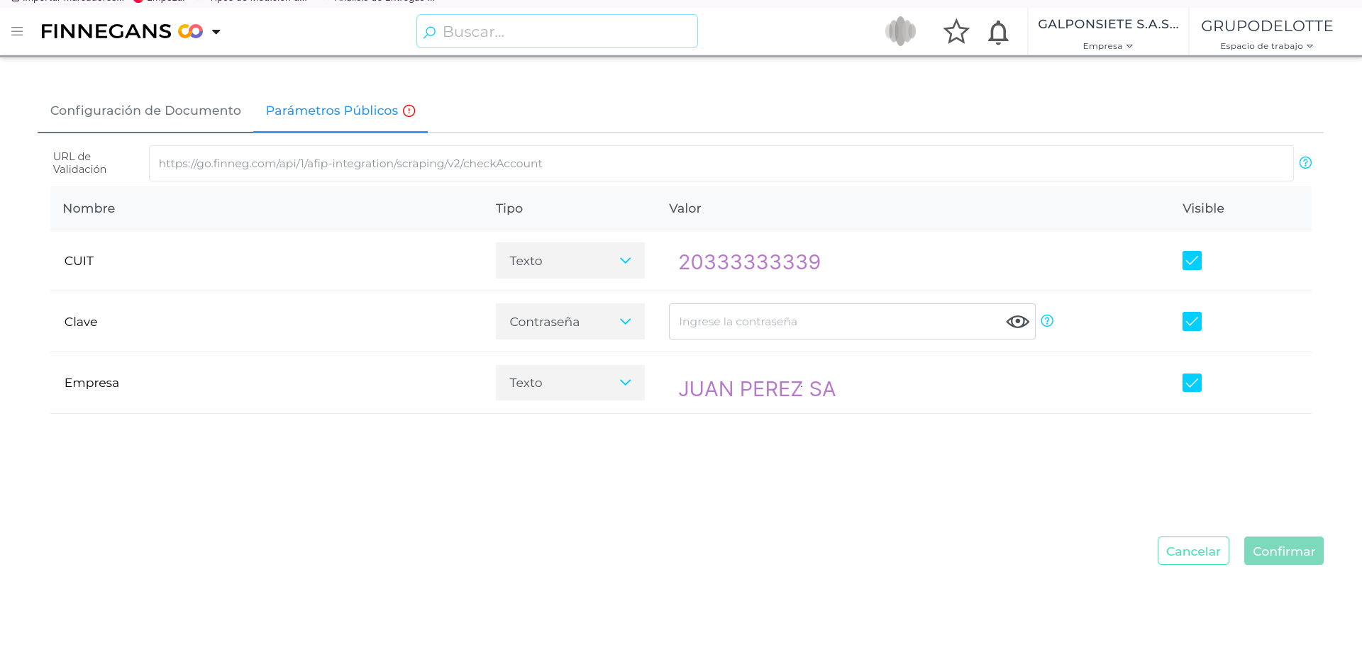 - Ir a la solapa de Parámetros Públicos y corroborar que la razón los datos de la columna “Valores”, según lo indicado.