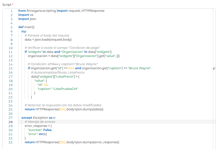 Vamos a analizar la estructura del siguiente script, su objetivo principal es recibir los datos de un formulario (o una petición), verificar si se seleccionó a un cliente/organización en particular (“Bruce Wayne”), y si es así, asignarle automáticamente una lista de precios específica antes de devolver los datos.