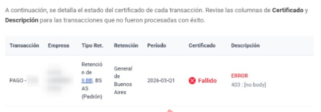 Acción: Deberás contactar a tu asesor contable para regularizar la situación impositiva ante ARBA. Una vez que el organismo te habilite, se podrá continuar con la generación de certificados.