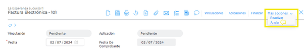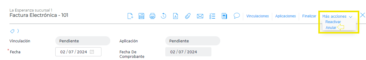 Para anular un comprobante ya enviado y aprobado por SIFEN se debe presionar el botón Anular ubicado en la toolbar superior en el combo Más Acciones