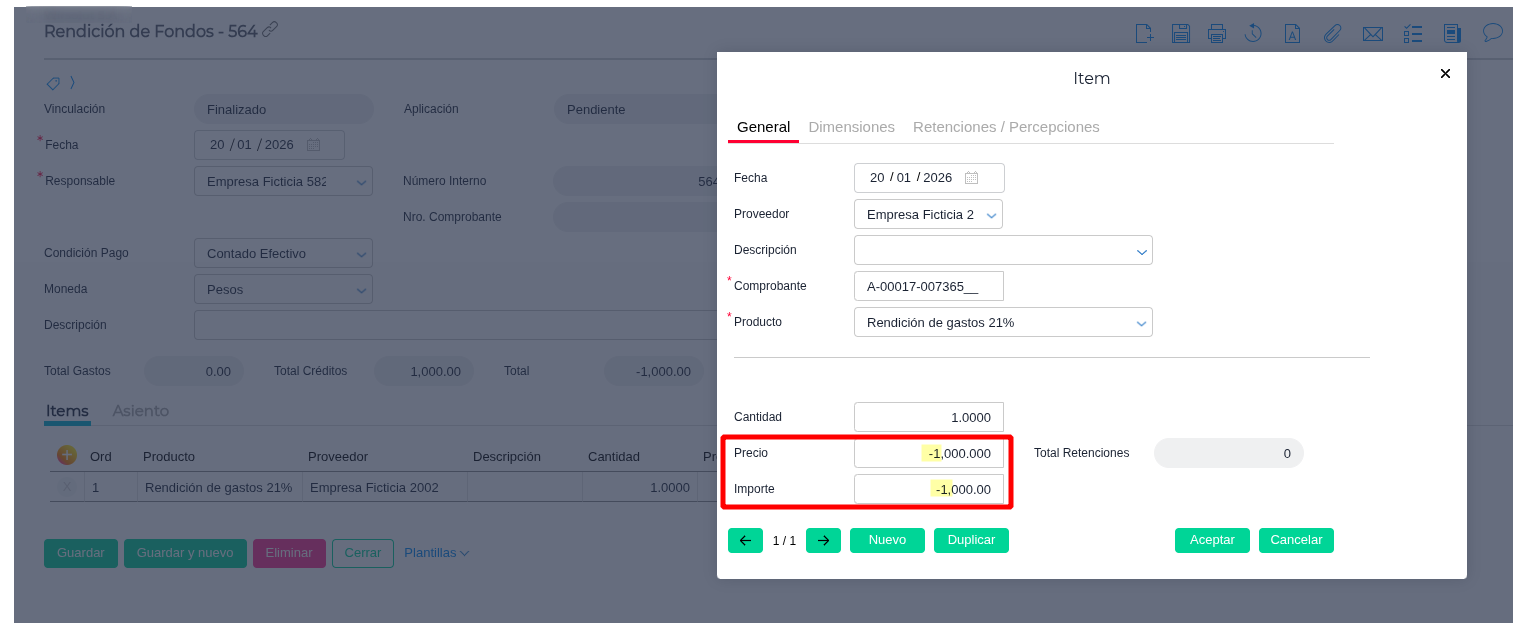 Importante: el precio y el importe tienen que estar con signo negativo. De esta forma, cuando se genere el comprobante, el mismo será una nota de crédito. En cambio, si se coloca el precio y el importe con signo positivo, entonces se generará una factura de rendición de fondos.