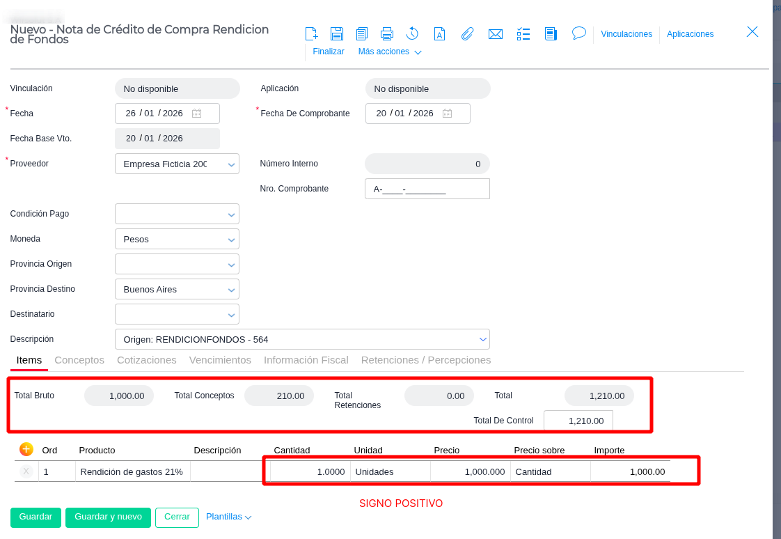 Importante: En este apartado, el precio y el importe deben quedar con signo positivo, ya que el documento ya está configurado con signo negativo. Si se le coloca los datos con signo negativo, quedará cargado todo con signo positivo, lo cual va a generar inconsistencias en los diferentes informes.