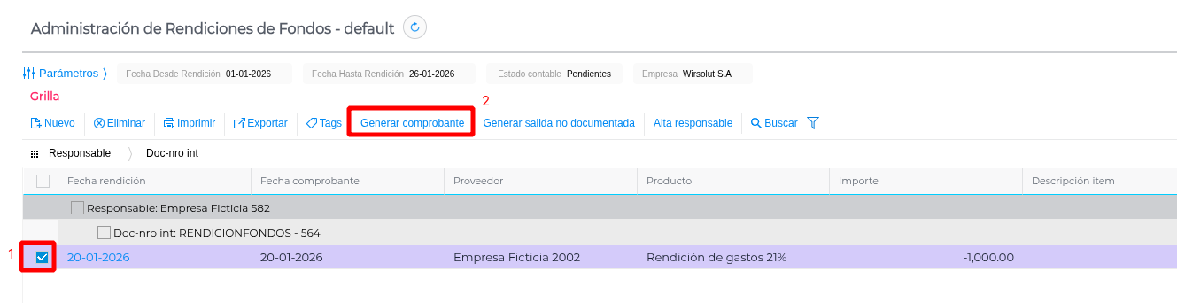 - Una vez cargada la rendición, volver a la grilla, seleccionar la rendición y hacer click en “Generar comprobante”.