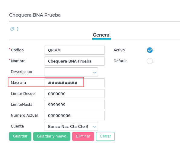 Chequeras (máscara de dígitos debe coincidir con el archivo a importar),