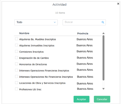 • El selector de actividad filtra las opciones según la Provincia destino configurada en el concepto de retención.