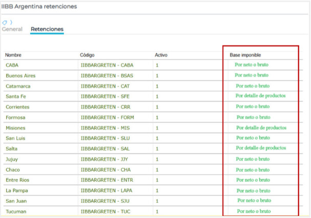 En la grilla de conceptos (solapa Retenciones), se podrá observar la columna “Base imponible”, la cual que muestra la configuración específica establecida para cada provincia.