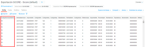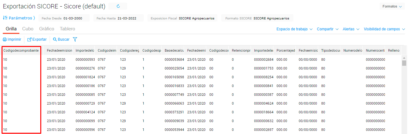 - CodigoDeComprobante: Surge del configurado en la columna Código Impositivo de la solapa Documentos de la Exposición Fiscal. Consultar esta Tabla:
