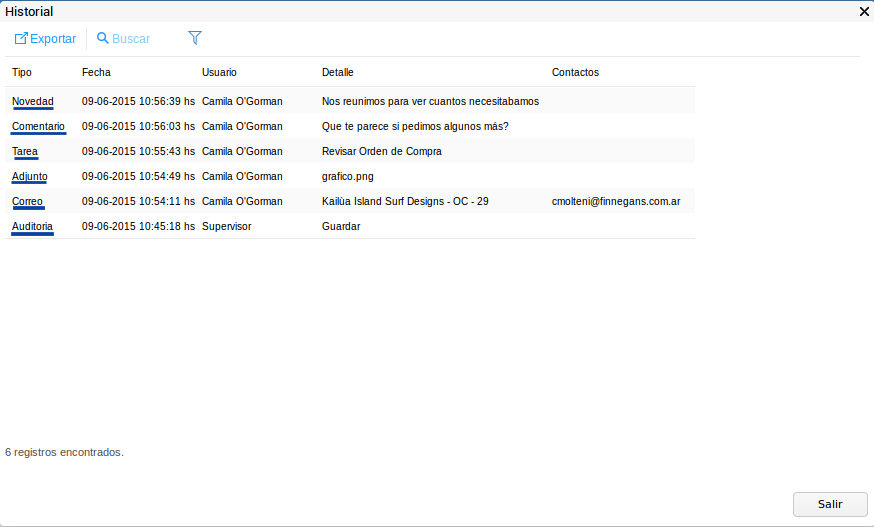 La columna contactos se mostrará completa sólo en casos de que la actividad sea un correo, y registrará el mail del contacto al que se le haya enviado.