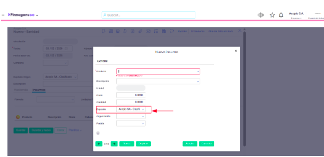 Verificar Herencia: Al agregar un nuevo ítem, confirmar que el campo “Depósito” del insumo se haya completado automáticamente con el valor definido en el paso 3.