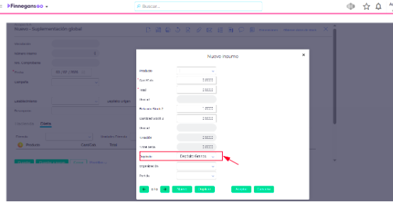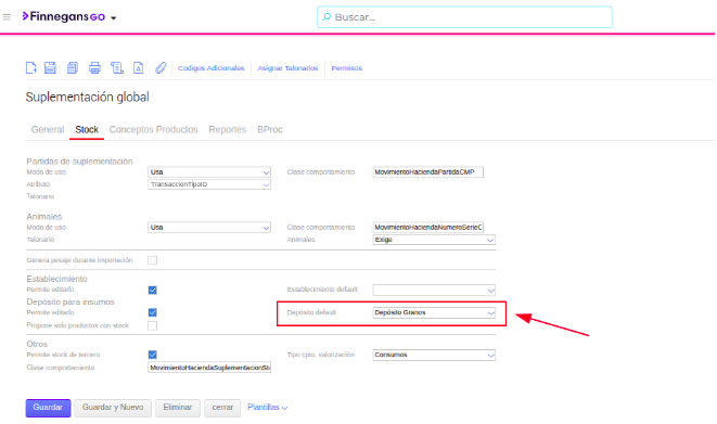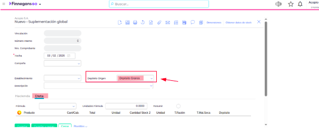 - Para Suplementación Global: Ve a la solapa Dieta. Al agregar un alimento, el campo “Depósito” ya tendrá el valor de la cabecera.