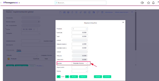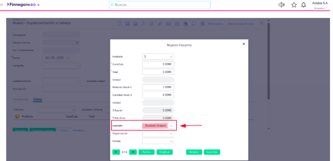 - Para Suplementación x Cabeza: Ve a la solapa Dieta. Al agregar un alimento, el campo “Depósito” ya tendrá el valor de la cabecera.