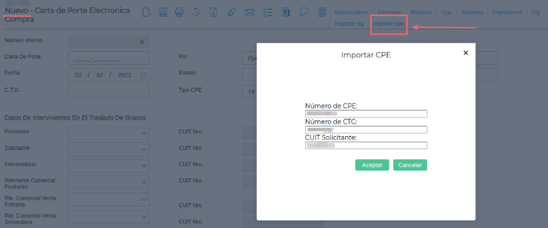 Ruta: Menú - Gestión Empresarial - Venta de granos - Traslado de granos - CPE