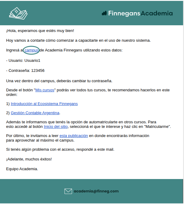 1. Al recibir el correo, hacer clic en el link del campus de Academia Finnegans para ingresar a los cursos