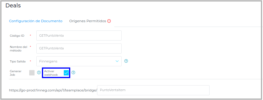 Luego activar el check “Activar Webhook” e ir a “orígenes permitidos”
