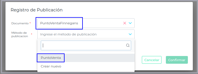 Ir a menú –> Deals–> Publicaciones –>Publicaciones Propias, agregar un nuevo método de publicaciones. Seleccionar documento “PuntoVentaFinnegans” y método de descarga “PuntoVenta”