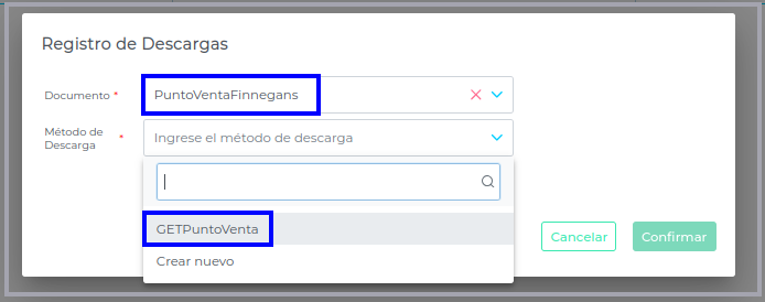 Ir a menú –> Deals–> Descargas –> Mis descargas, agregar un nuevo método de Descargar. Seleccionar documento “PuntoVentaFinnegans” y método de descarga “GETPuntoVenta”