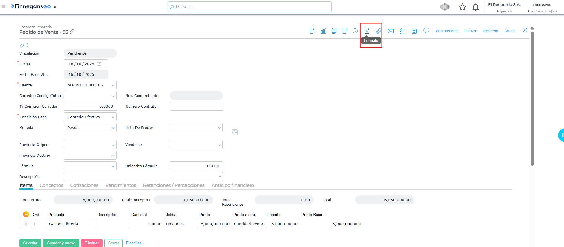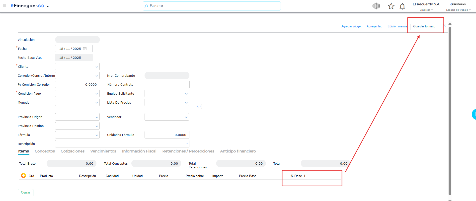 - Una vez aceptado todas las ventanas de configuración de widgets, se visualiza el campo %Desc. visible. Por último hacer click en el botón “Guardar formato”.